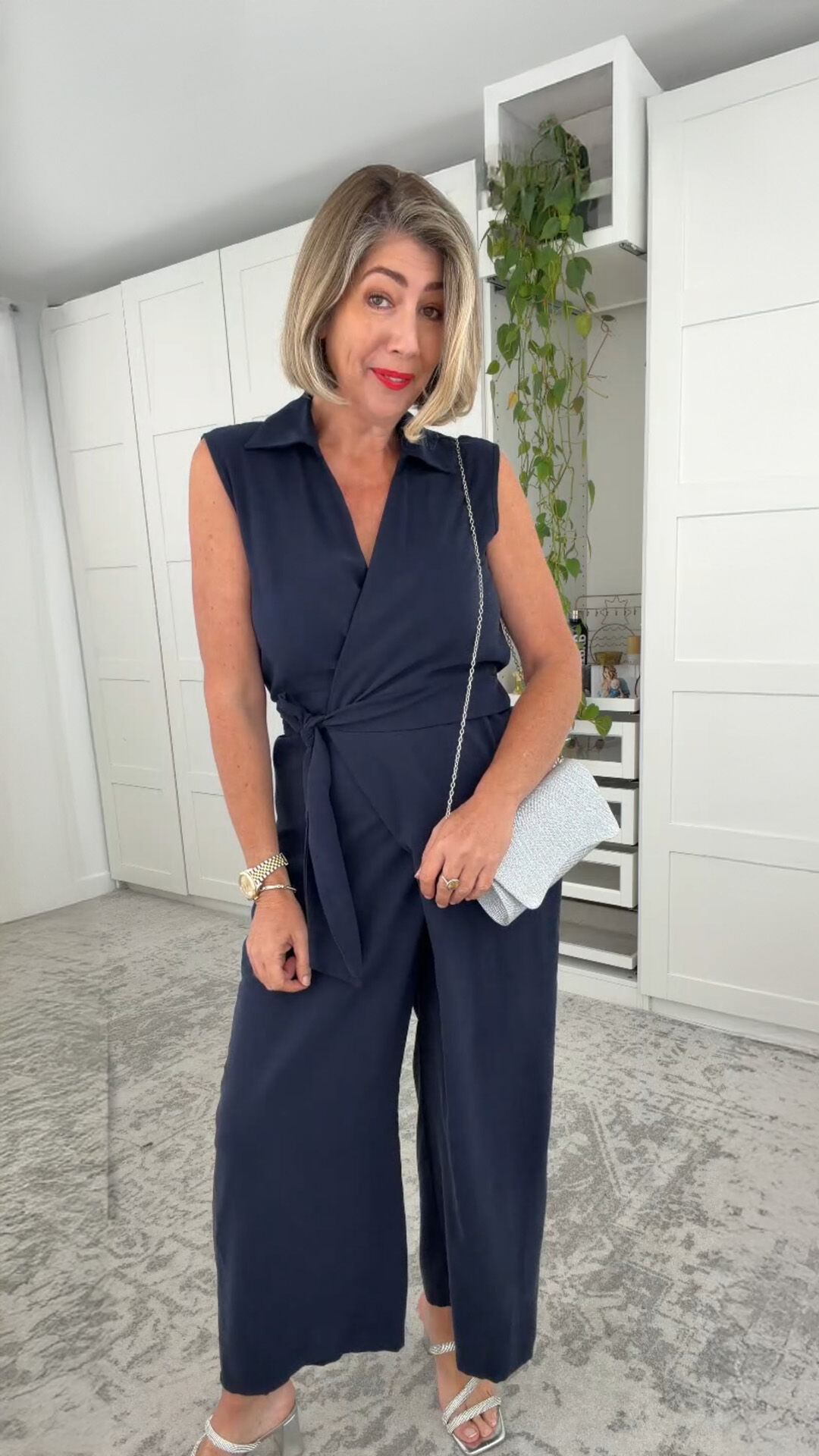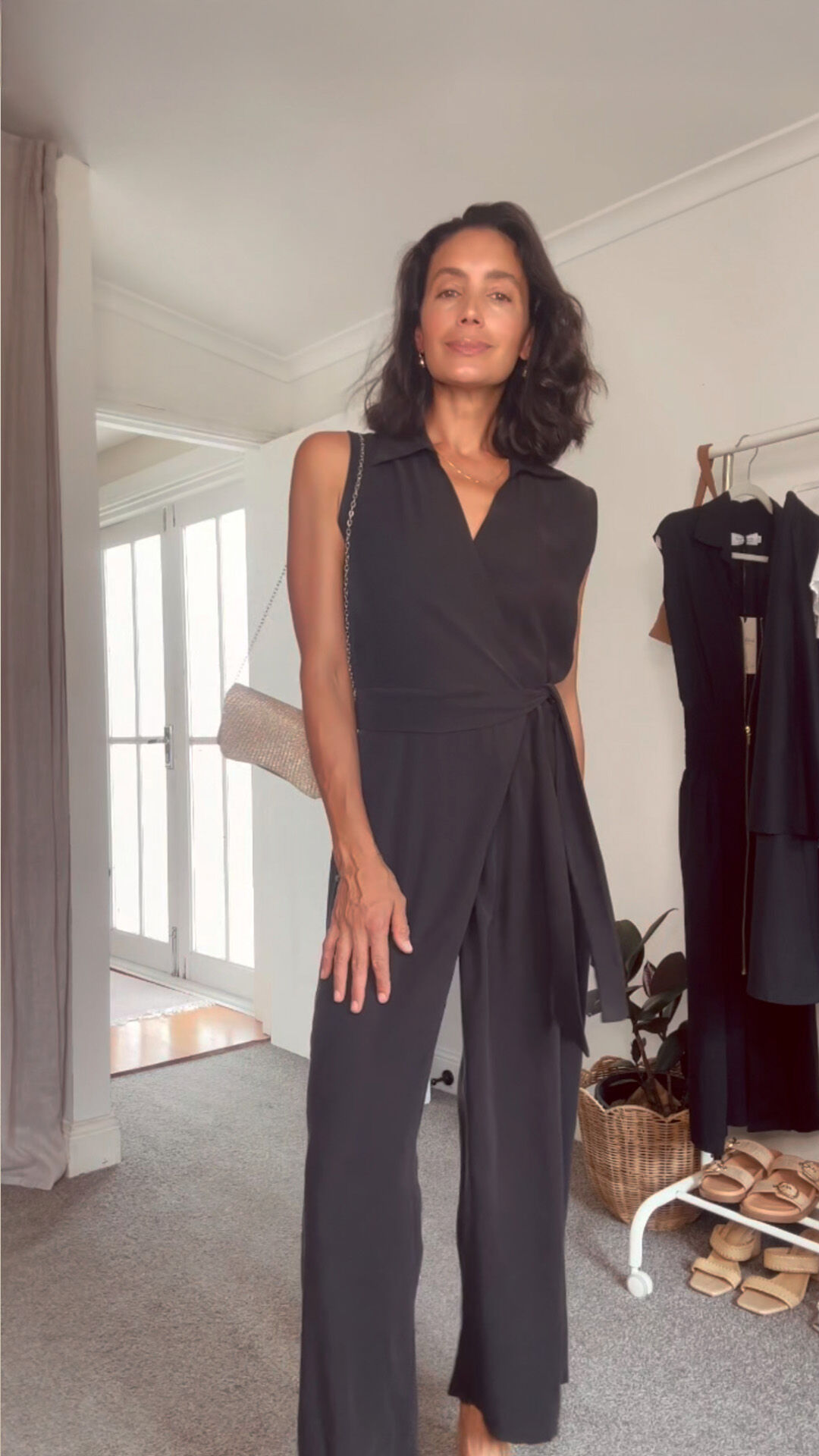 The Alex Sleeveless Jumpsuit offers effortless elegance in a contemporary wide-leg silhouette. Made from a sophisticated rayon blend, this jumpsuit provides a beautiful drape and comfortable feel. The design features a classic collar to a flattering sleeveless wrap-style bodice, accentuated by a wide, self-wrap-around waist tie. For all-day comfort and flexible fit, the waist also includes an elasticated back. The intentional omission of pockets contributes to a sleek, streamlined look.