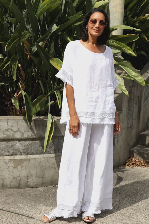 Discover ultimate comfort and effortless style with our Antonia Wide-Leg Linen Pants. Crafted from breathable linen, these pants are your perfect companion for sunny days and relaxed evenings. The wide-leg silhouette offers a flattering drape and unrestricted movement, while the elasticated drawstring waist ensures a perfect fit. A touch of understated glam comes from the delicate sequin detailing and chic frayed hem, making them ideal for everything from poolside lounging to a stylish dinner out.