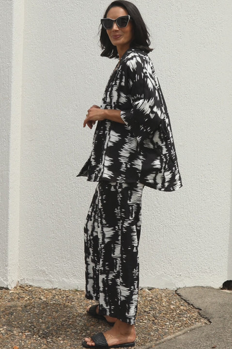 The Campania Short Sleeve Top is where comfort meets modern design. The abstract black and white print brings a fresh, artistic vibe to your wardrobe, making it a standout piece for any occasion. Offering a relaxed fit and timeless design, this button-up shirt features a stylish collared v-neckline and 3/4 sleeves. Crafted with natural fibre blend fabric, it is breathable and perfect for the warm season.