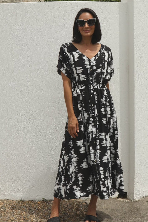 Campania Print—This abstract black and white print brings a fresh, artistic vibe to your wardrobe, making it a standout piece for any occasion. Crafted with a natural fibre blend fabric, it is breathable and perfect for the warm season....