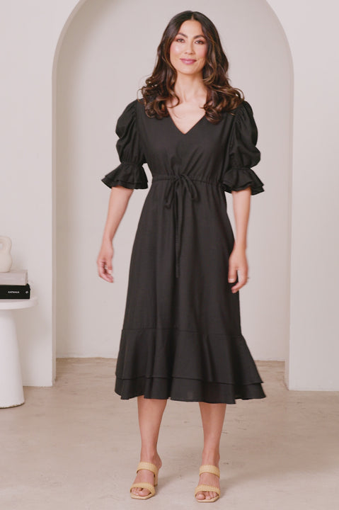 Laguna Short Balloon Sleeves V-Neck Midi Dress Black