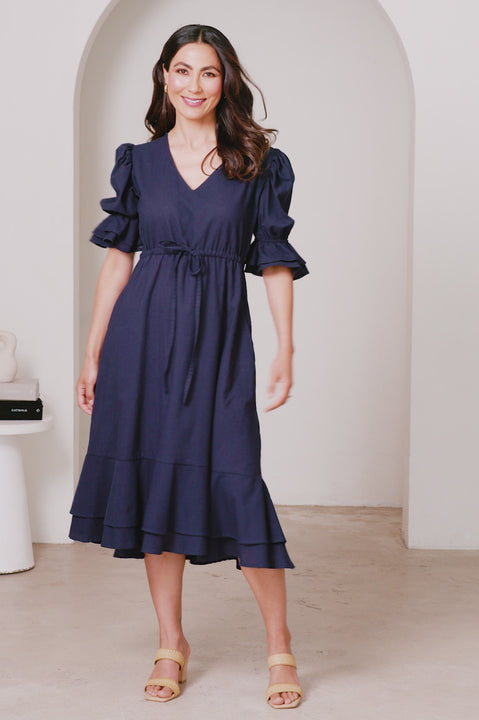 Laguna Short Balloon Sleeves V-Neck Midi Dress Navy- Pre Order