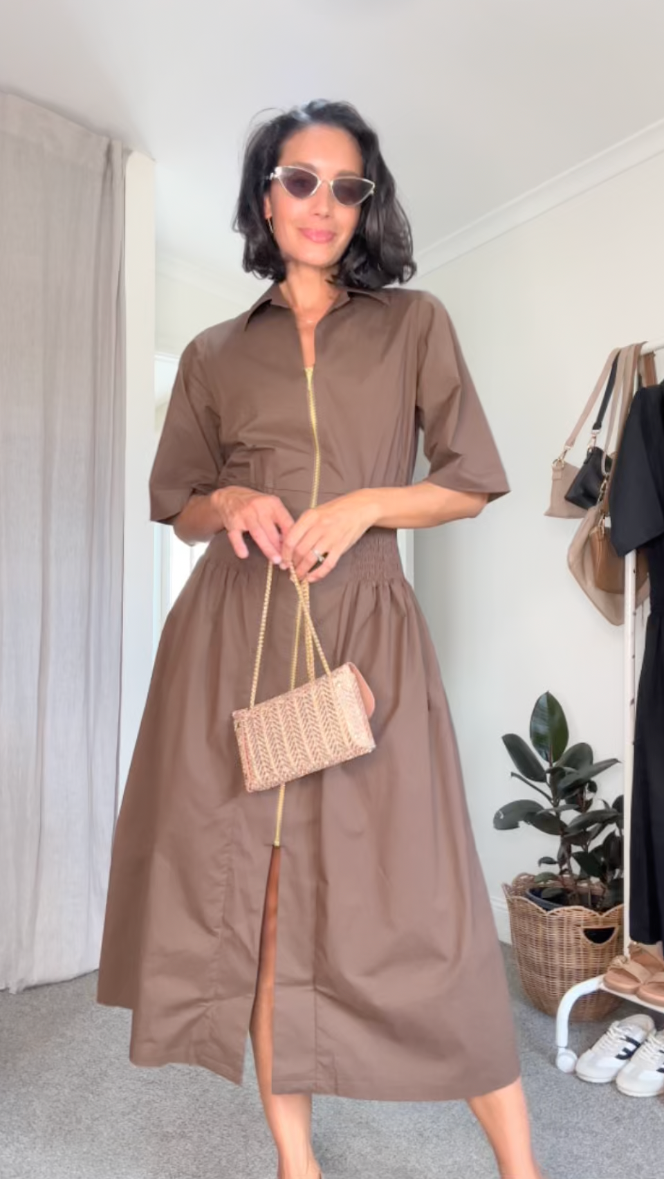 Laura Short Sleeve Smocked Waist Zip Front Midi Dress Brown