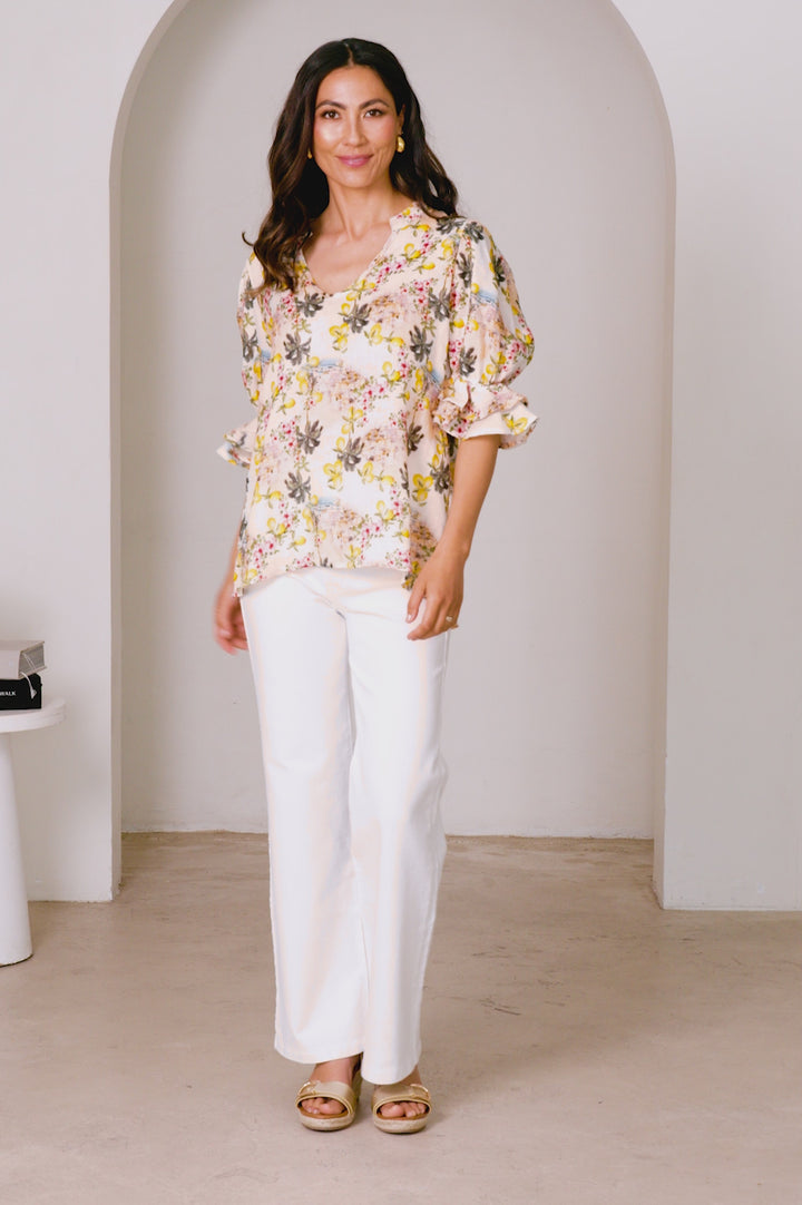Positano Floral Mid Sleeve V-Neck Linen Top
